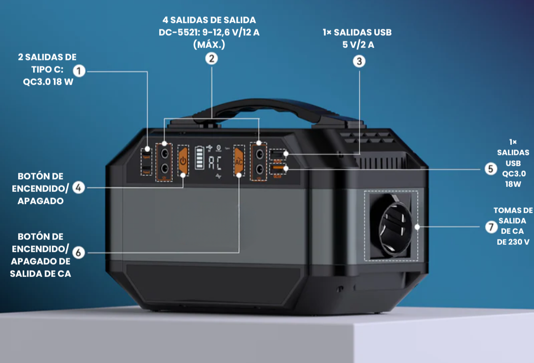 Con una salida de 330 W y una capacidad de 288,6 Wh, esta estación de energía portátil es el compañero ideal de viaje. Garantiza energía continua para tus dispositivos en cualquier momento y lugar, ya sea en aventuras al aire libre o paseos urbanos. Una solución ligera, eficiente y confiable para mantener la vitalidad y conectividad en tus trayectos.