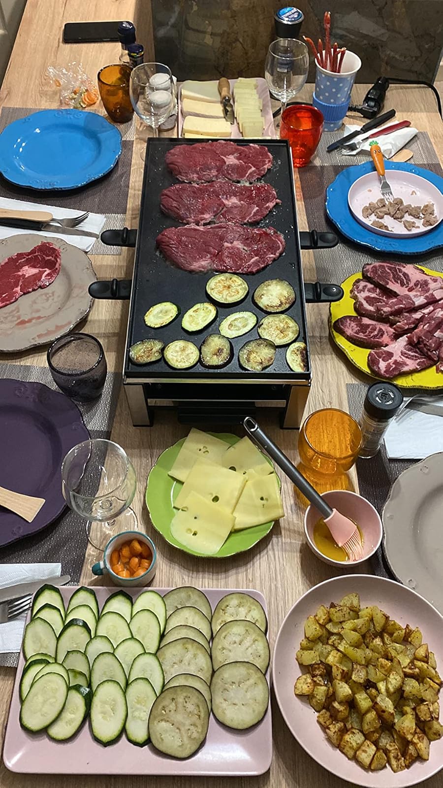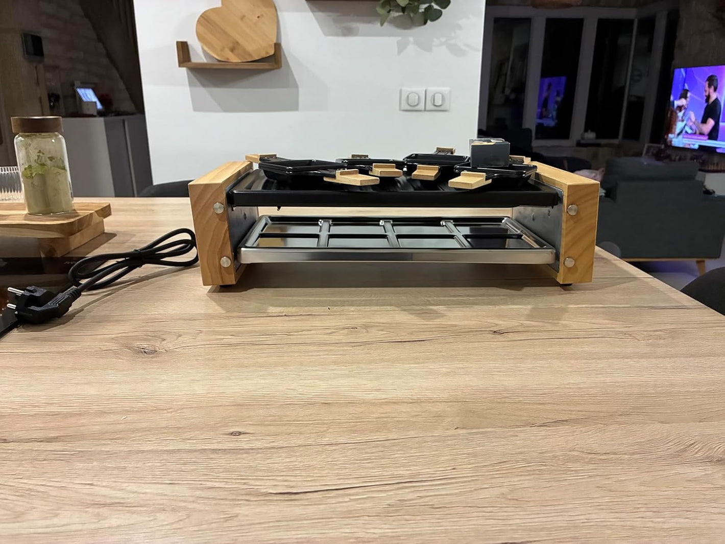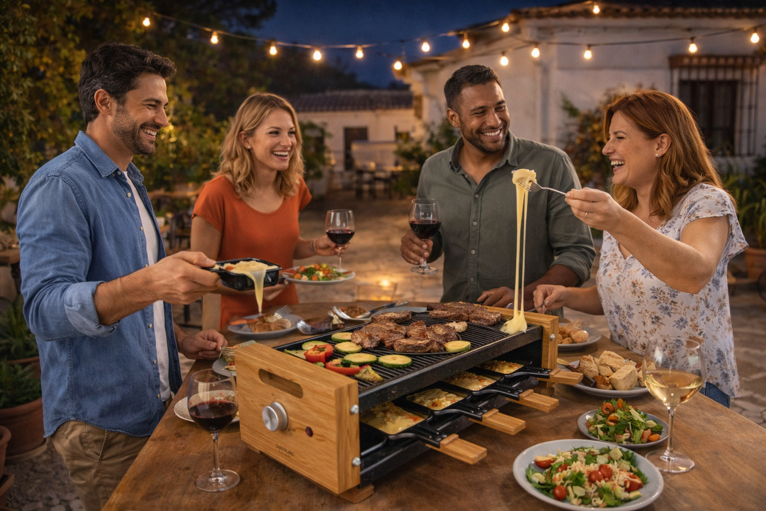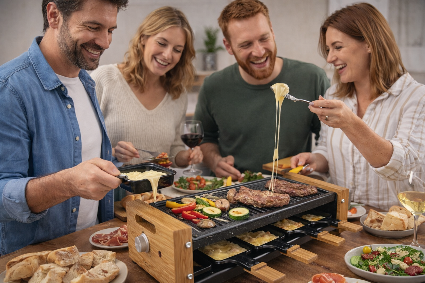 Esta raclette está diseñada para hasta 8 personas, ya que incluye 8 sartenes individuales. Es ideal para cenas con amigos o familia, donde cada comensal puede preparar su comida a su ritmo directamente en la mesa, sin esperas ni turnos.