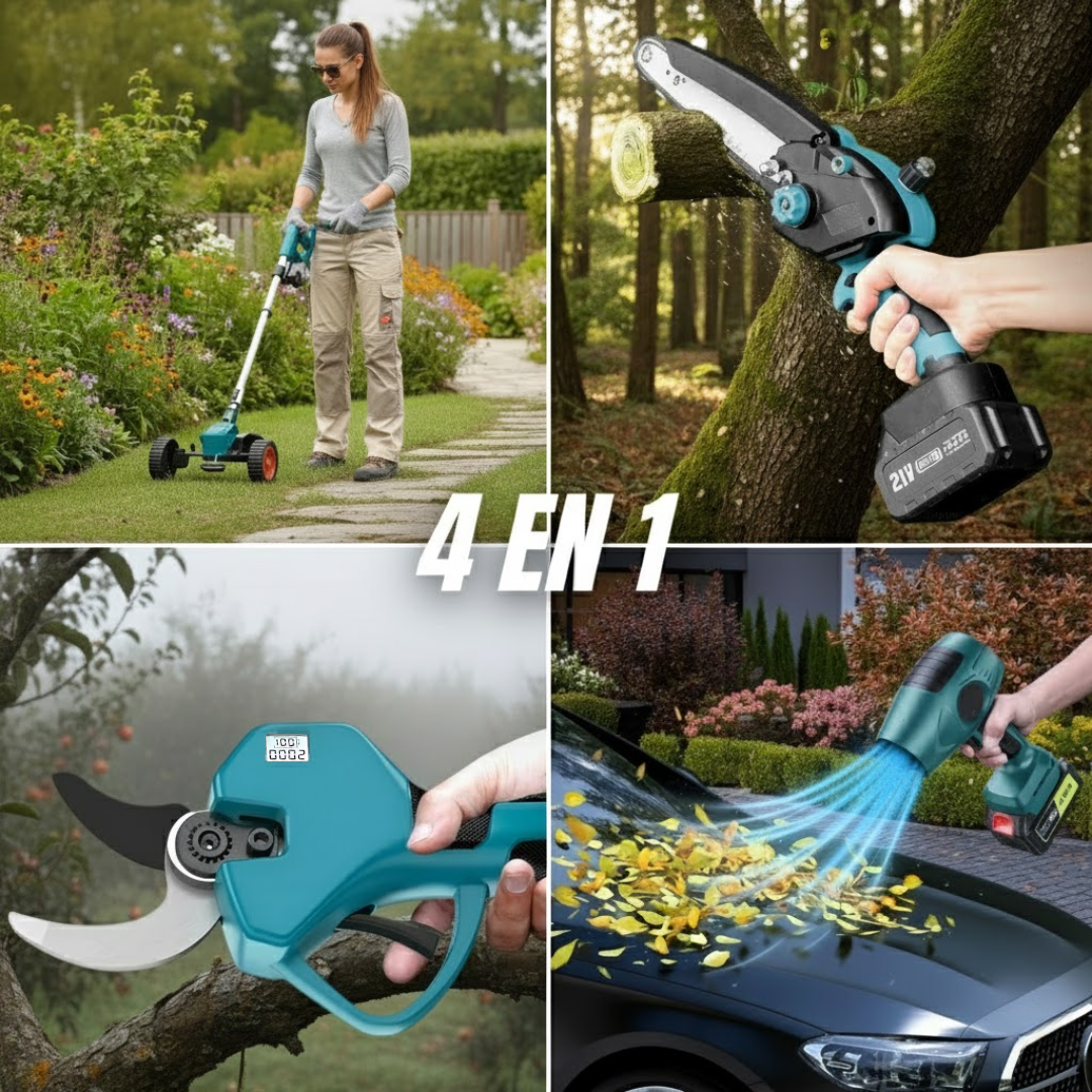 Sí, el kit viene completo con tijera eléctrica, mini motosierra, soplador y desbrozadora, además de la batería, el cargador y los accesorios básicos.